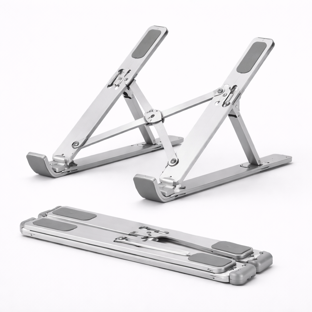 The foldable structure collapses flat for effortless storage in laptop bags or backpacks. Anti-slip silicone pads securely hold your laptop in place and protect it from scratches, while the open design improves airflow for better heat dissipation. Ideal for office desks, home workstations, and on-the-go professionals, the SlimFold stand supports most laptop sizes with reliable stability.